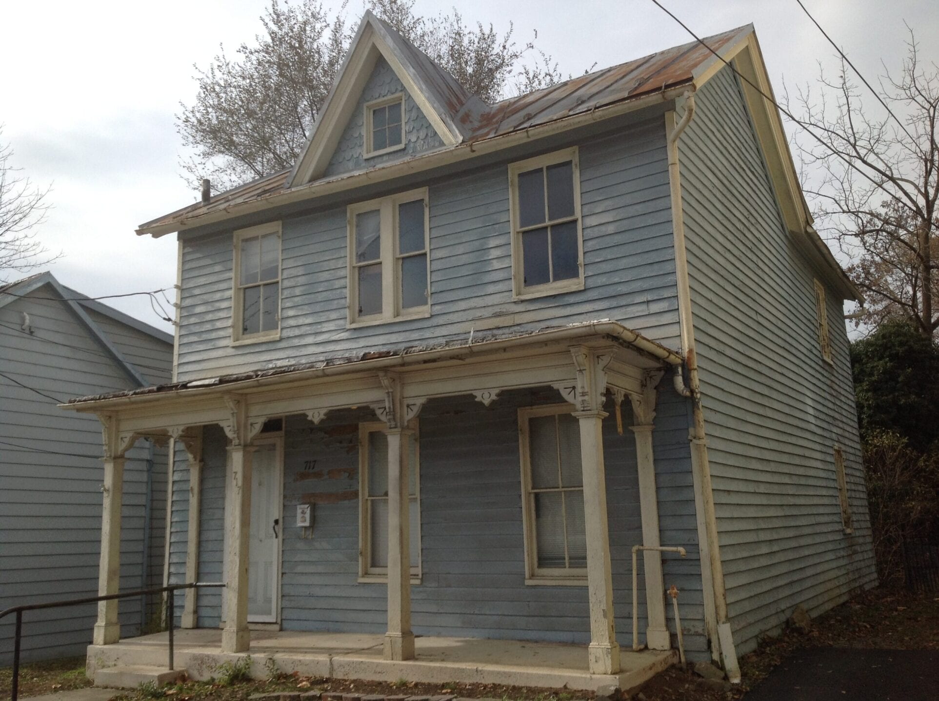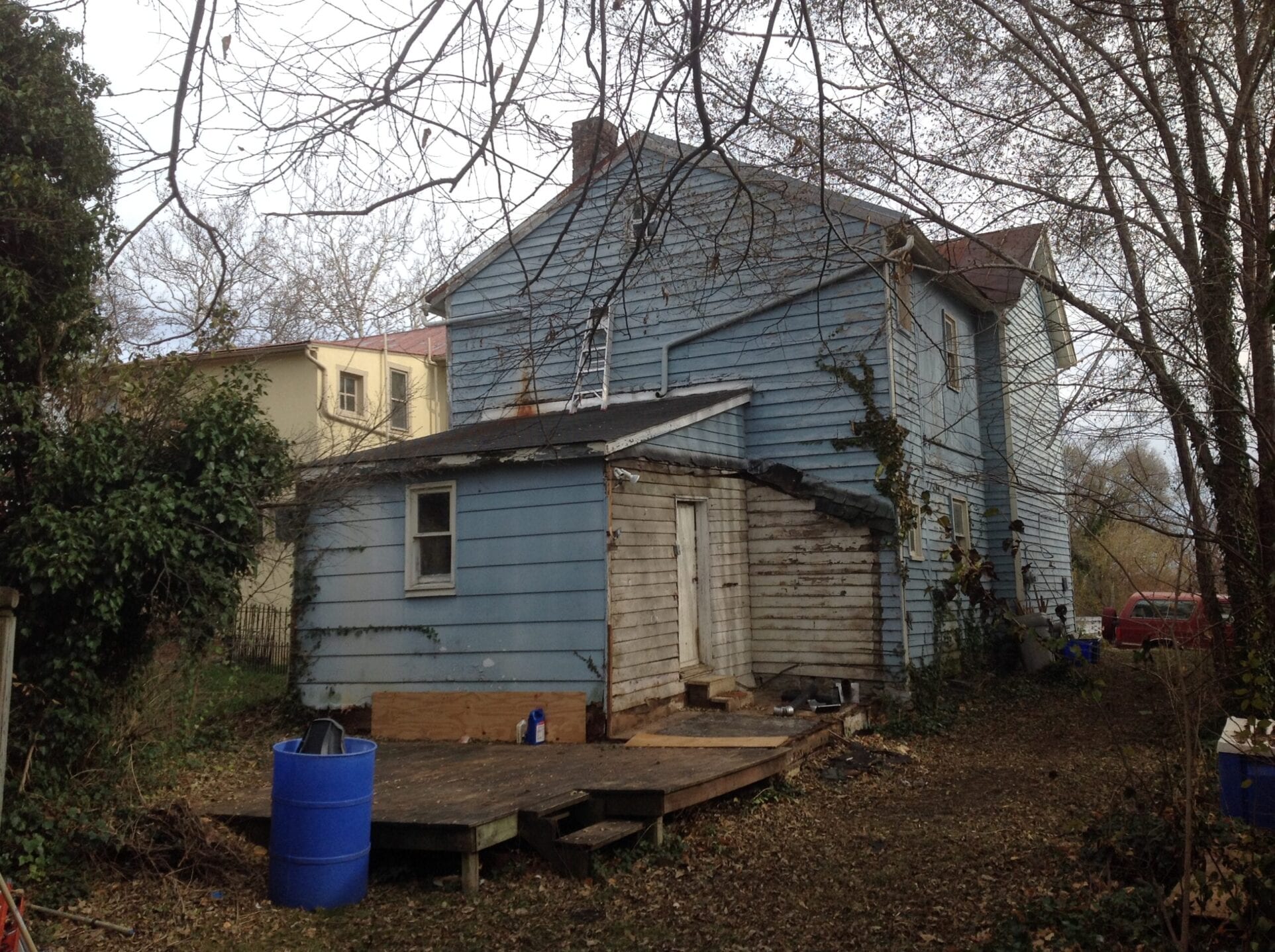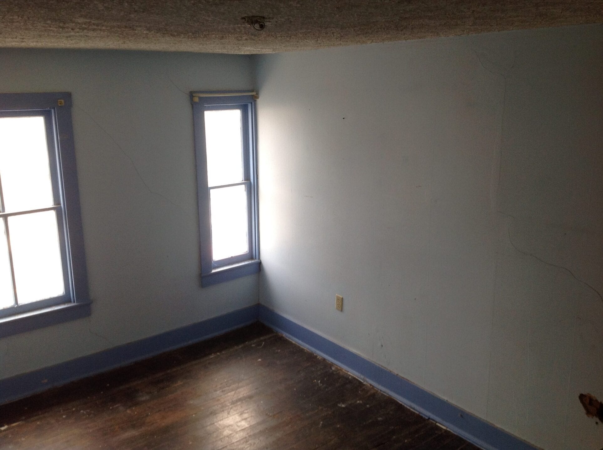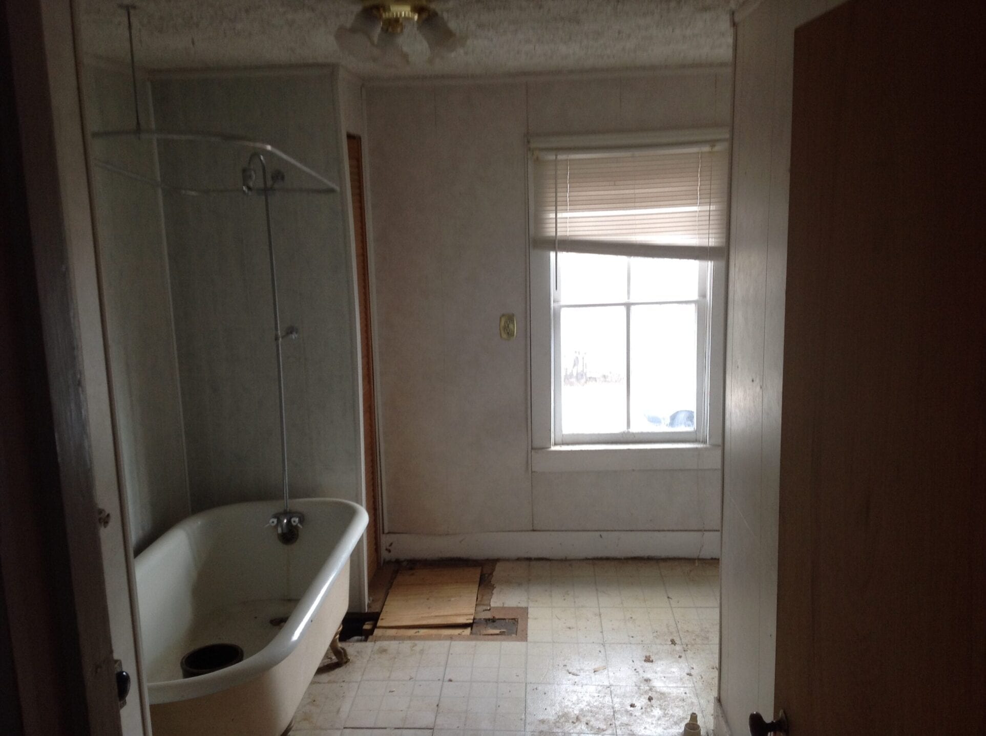 Nov 2014…The upstairs bath. That closet at the end covered up one of the narrow front windows. Floor structure seriously compromised by cutting for the plumbing waste.
