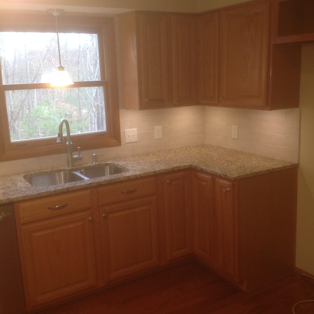 After…full tile backsplash and new pendant light. Frig has an open cabinet above it.